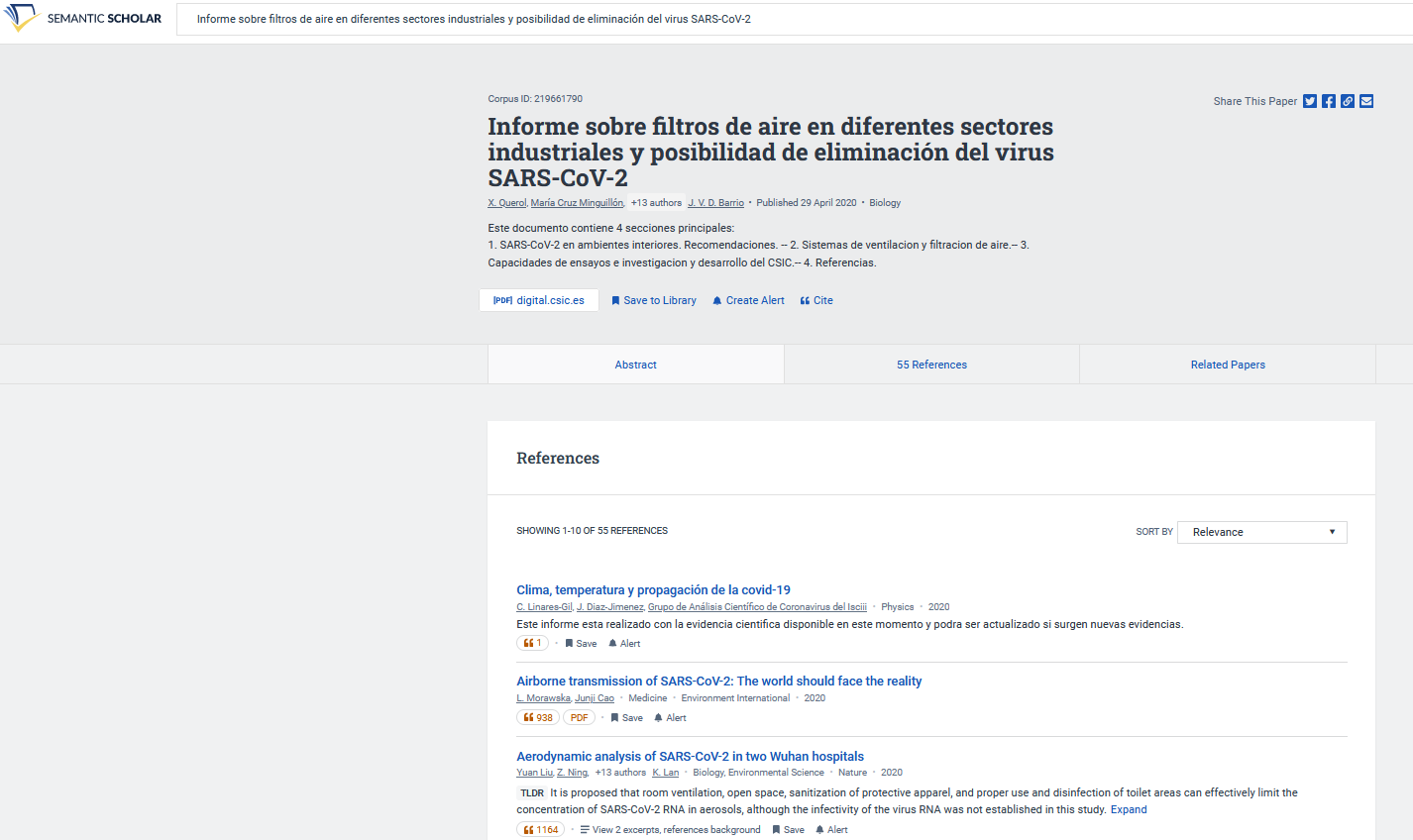 La Colección COVID-19 superó los 1.000 resultados de investigación CSIC y ya ha sido integrada en distintos agregadores de ciencia abierta en general (por ejemplo, el informe de Querol et al. [2020] aparece en Semantic Scholar) (fig. 4) o en herramientas de referencia sobre COVID-19 (donde, por ejemplo, ese mismo informe aparece en el portal temático construido por OpenAire)