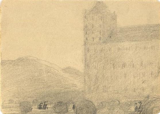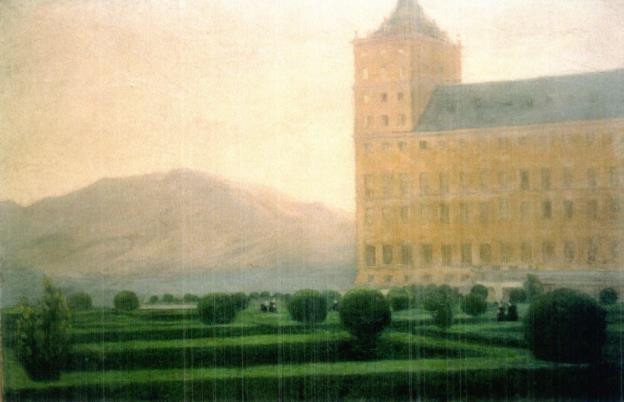 Javier de Winthuysen decidió tempranamente dedicar su vida a la pintura (Añón y Sancho, 1990, p.21). Este anhelo se verá recompensado, con su ingreso en la Escuela de Bellas Artes de Sevilla, en el estudio de G. Bilbao y en la sección de Bellas Artes del Ateneo. Esta instrucción quedará complementada con sus viajes a París. J. Winthuysen elaboró gran cantidad de obras pictóricas. Dentro de la colección fotográfica, se conserva un testigo de esta labor. Un negativo muestra la imagen de un cuadro dentro de un taller[3]. La obra representada es una vista del Real Monasterio de El Escorial, desde su fachada oriental, con vistas al Jardín de los Frailes (figs. 1 a 4). En ese mismo negativo se atisba una anécdota interesante. En la pared, se pueden vislumbrar fotografías adheridas, una herramienta indispensable en su quehacer artístico. Esta curiosidad queda corroborada en la misma colección fotográfica. Se conserva una fotografía con la misma vista del cuadro[4], del Real Monasterio. Además, en la colección de dibujos, se poseen dos bocetos de la misma vista[5].