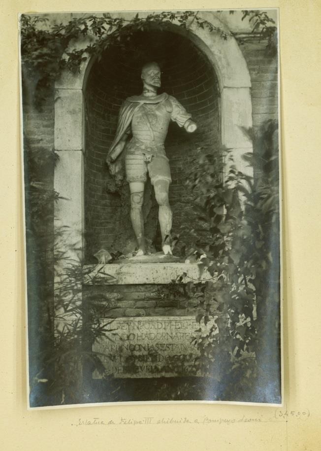 En algunas ocasiones, estos espacios permanecen en el perenne olvido, como sucede con el Palacio de los marqueses de Velada, en Toledo. En otras, las consecuencias de este desentendimiento se destacan como irreparables. Un ejemplo es la escultura de Felipe II que adorna el Jardín del Rey en el Real Sitio de Aranjuez. Esta estatua de una factura similar a la que otrora efectuase para el monarca de los Austrias mayores los dos Leoni, perdió en el transcurso del tiempo, los miembros superiores y un león que se hallaba a los pies del rey. Este acontecimiento es narrado por J. de Winthuysen, quien señaló como en su primera visita la estatua se mantenía incólume, mas en posteriores consultas, la estatua fue perdiendo diversas partes[11] hasta el estado en que hoy se encuentra (fig. 16).