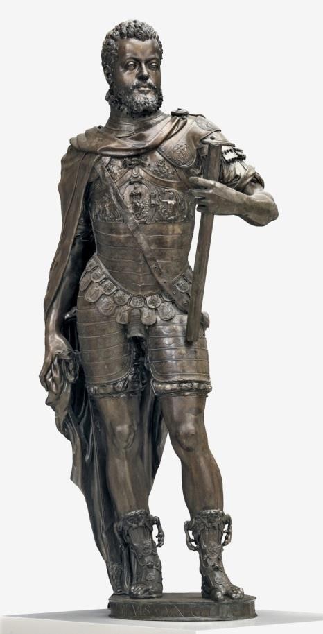 Figura 16. Fotografía (signatura: [Div IX. Fot. 1/ Cap. 05/0083] con la mutilada escultura de Felipe II del Jardín del Rey en Aranjuez (izquierda). Escultura en bronce de Felipe II, de Pompeo y Leone Leoni, en el Museo del Prado (Núm. Catálogo: E000272) (derecha).