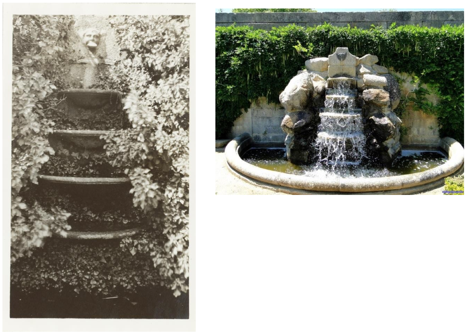 Figura 15. Fotografía de la fuente cascada rústica de la Casita del Príncipe, cubierta de vegetación (izquierda). La misma fuente, en la actualidad. Se atendió al abandono y recuperó su imagen (derecha).