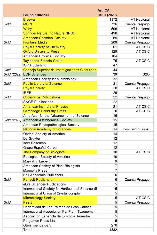 “En la tabla de la figura 1 (obtenida desde GesBIB-Publicaciones) se pueden ver ordenados de mayor o menor los editores científicos en los que ha publicado el CSIC en 2020. Se ha destacado en amarillo todos aquellos sobre los que ya hay algún soporte desde el Programa.”