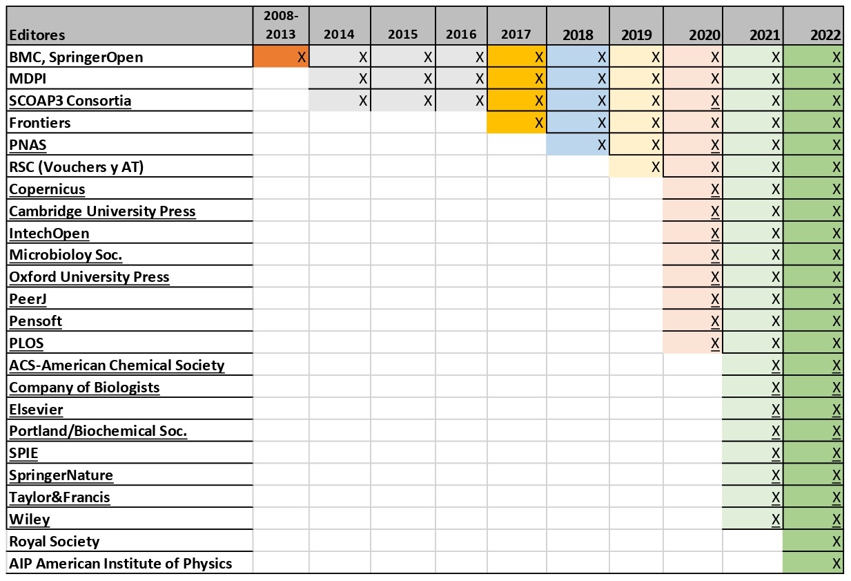 Conscientes de este nuevo escenario, URICI incluyó dentro de su presupuesto de 2008 para suscripciones una pequeña cantidad para que los autores del CSIC publicaran en las revistas de BioMed Central, una de las primeras editoriales Gold en el mundo, y a lo largo de los años siguientes continuó trabajando con editoriales Full OA (Frontiers, MDPI) hasta que en 2019 firmó el primer acuerdo transformativo que se ha hecho en España, con la Royal Society of Chemistry