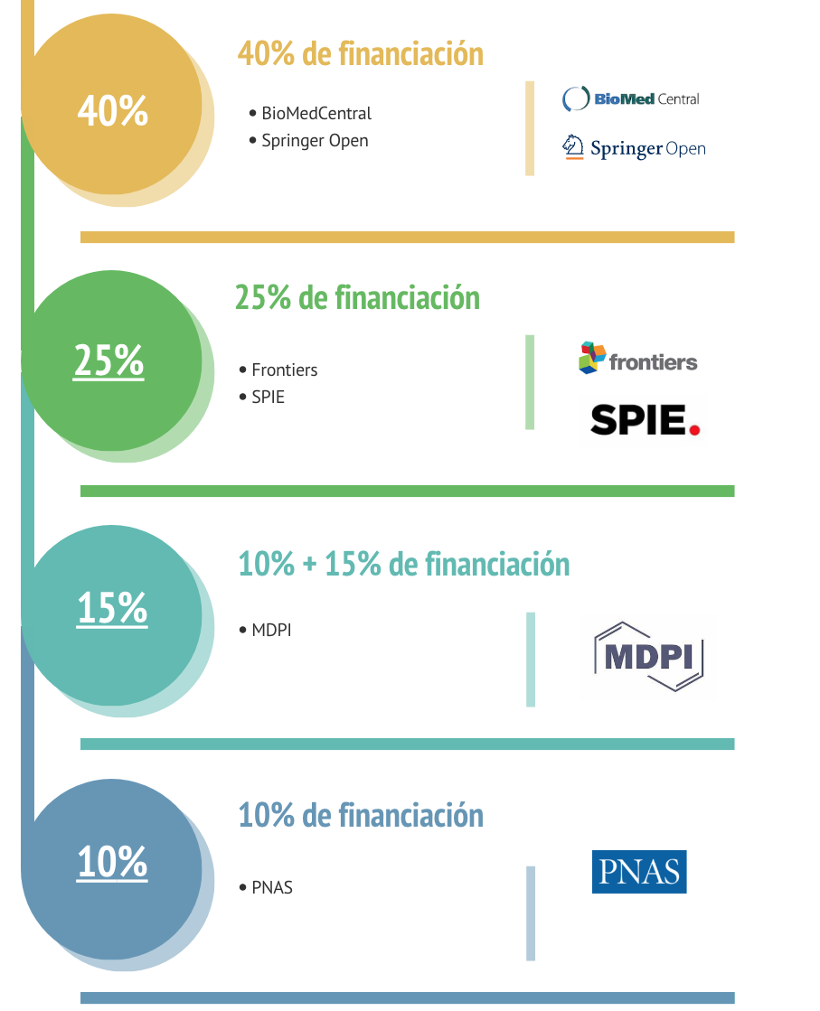 Esta página web se ha rediseñado a principios de 2021, haciéndola más visual y accesible tanto a los autores como a las bibliotecas y se ha organizado la información en función del % de financiación que tendrá la APC del editor del que se trate. Se destacan asimismo en ella dos informaciones que hay que tener muy a mano: